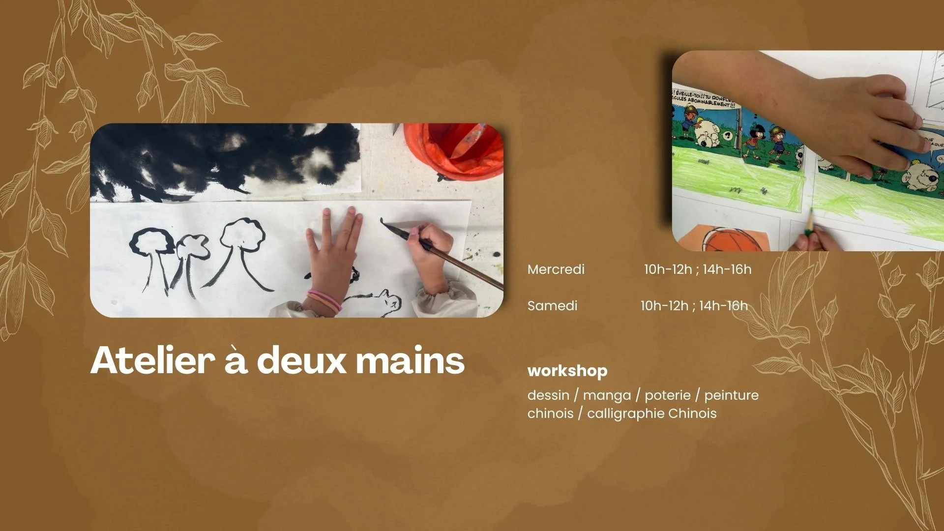 Ouvert aux enfants, adolescents et adultes, il propose des cours et ateliers réguliers permettant d’explorer diverses disciplines : dessin, manga, peinture chinoise, calligraphie, poterie.Encadrés par des artistes et intervenants qualifiés, les participants développent leur sens de l’observation, leur créativité et leur technique dans un cadre bienveillant et stimulant.